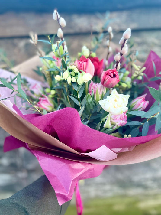 We grow our own gorgeous flowers on our micro flower farm in Owslebury and hold a limited stock of British-grown flowers from hand-picked suppliers. Whilst growing and buying in British flowers is our priority, in winter (and at other times of year if specifically required) carefully selected imported blooms are also used.